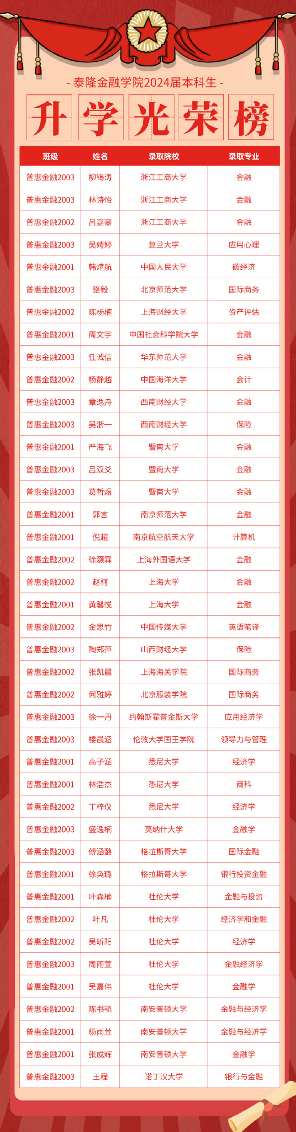 在学校各类奖学金的基础上,面向本院学生增设特色奖学金,额度高,覆盖面高达80%。如“泰隆之星”奖学金、勤朴学习优秀奖学金、诚毅学习互助奖学金和国际交流专项奖学金等。其中,国际交流专项奖学金额度最高48000元,泰隆之星奖学金额度为10000元。
