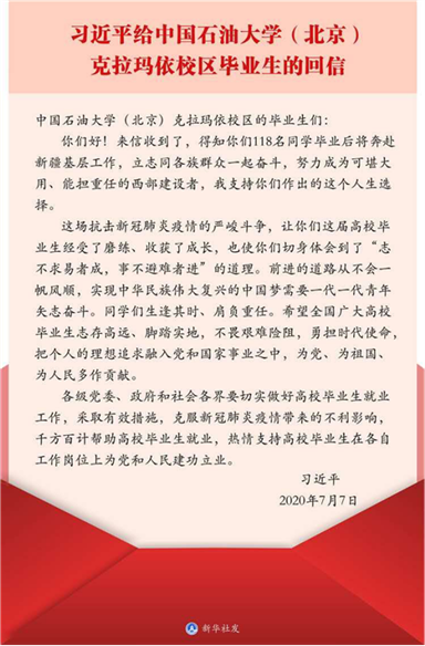 团委书记张明飞老师、各学生组织负责人、各班团支书和首期普惠精英班(青峰班)全体学员参与。/p> 2020/span>年7/span>月7/span>日,习总书记给中国石油大学(北京)克拉玛依校区毕业生回信,肯定他们到边疆基层工作的选择,对广大高校毕业生提出殷切期望。习总书记在回信中还指出,这场抗击新冠肺炎疫情的严峻斗争,让这届高校毕业生经受了磨练、收获了成长。前进的道路从不会一帆风顺,实现中华民族伟大复兴的中国梦需要一代一代青年矢志奋斗。/p> 在集中学习完回信精神后,张明飞老师分享了我校优秀志愿者何林秀毕业后扎根西藏、服务西藏的感人事迹,并对成人短视频