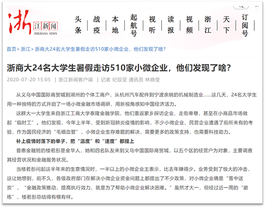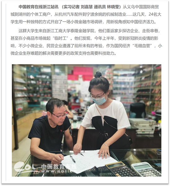 24/span>名大学生,重返家乡探访企业、走街串巷,甚至在小商品市场做起“临时工”。从义乌中国国际商贸城到湖州的个体工商户,从杭州汽车配件到宁波余姚的机械制造业……此次暑期社会实践调研团队一共分为6/span>组,每组4/span>人,分别在杭州、温州、宁波、金华等地进行,共走访了510/span>家小微企业。/span>/p> 他们用一种独特的方式开启了一场小微金融市场调研,用新视角感知中国经济活力。今年上半年,受到新冠肺炎疫情的影响,不少小微企业、民营企业遭遇了前所未有的考验,作为国民经济“毛细血管”,小微企业生存难题的解决需要更多的政策支持也需要科技助力。/span>/p> 调研团队主要了解家乡的小微企业的经营状况和金融服务情况,在调研的这段时间,他们接触到了各种类型的小微企业,身边随处可见的小吃店、服装店、超市,60%/span>小微企业的月营业额在5/span>万元以下。再从企业规模看,这次调研结果显示,60%/span>的小微企业员工不到5/span>人,经营年限在5/span>年以上的企业占50%/span>。小微企业及个体户中,大部分是联系千家万户的“小店经济”,在调研中发现,20.5%/span>小微企业及个体户面临现金流危机。其中,有融资需求的小店中,70%/span>的小微企业主表示只要给予一点支持,就能很快迈过难关。/span>/p> 虽然这些大学生都才大一,他们宣传国家出台的一系列金融综合改革政策外,还倾听小企业主们的心声,并真实地将他们的所见、所闻、所感记录了下来。通过这次调研的内容可以了解当地小微金融市场需求状况,结合现有金融产品系,确定未来可提供的具体产品策略,包括担保、利率、期限和还款方式等主要要素,另外本次实践调研中获得的调研数据,也将会用于之后的“挑战杯”大学生课外学术作品竞赛中。这是一次很有意义的调研活动,让还在学理论的大一学生回到家乡调研,感受中国经济的脉动,既有一种情怀也有一种责任。/span>/span>/p> 这次意义特别的调研活动受到许多校内外媒体的关注和报道,包括中国教育在线、钱江晚报、浙报融媒体、浙江新闻、科技金融时报等多家媒体都对成人短视频