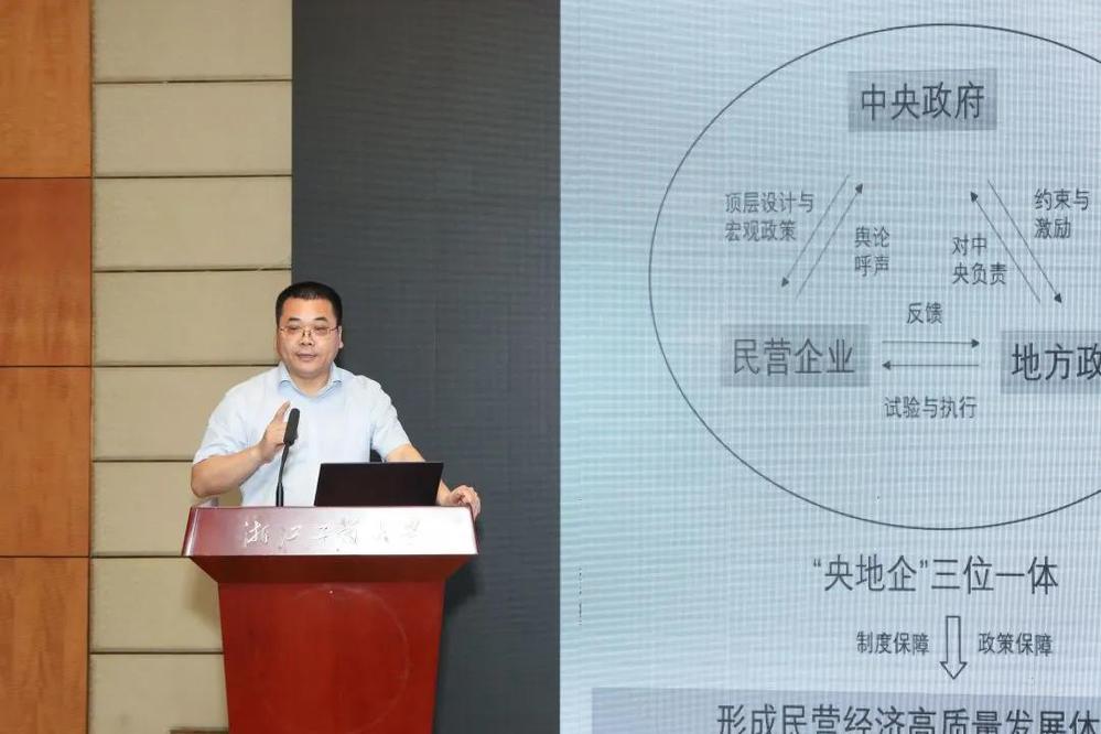 浙江大学经济成人短视频 副院长潘士远教授就我国民营经济的重要性与其发展阶段、发展现状等方面展开论述。他指出民营企业以小微企业为主,面临着创新发展、协调发展、绿色发展、开放发展、共享发展、融资保障方面的诸多问题。他强调,“央地企”三位一体治理框架有利于推动形成民营经济高质量发展的体制机制,是推动民营经济发展质量变革、效率变革、动力变革的重要制度保障与政策保障。他还从创新、竞争、融资与环境四个维度系统性提出了民营经济转向高质量发展的政策举措。