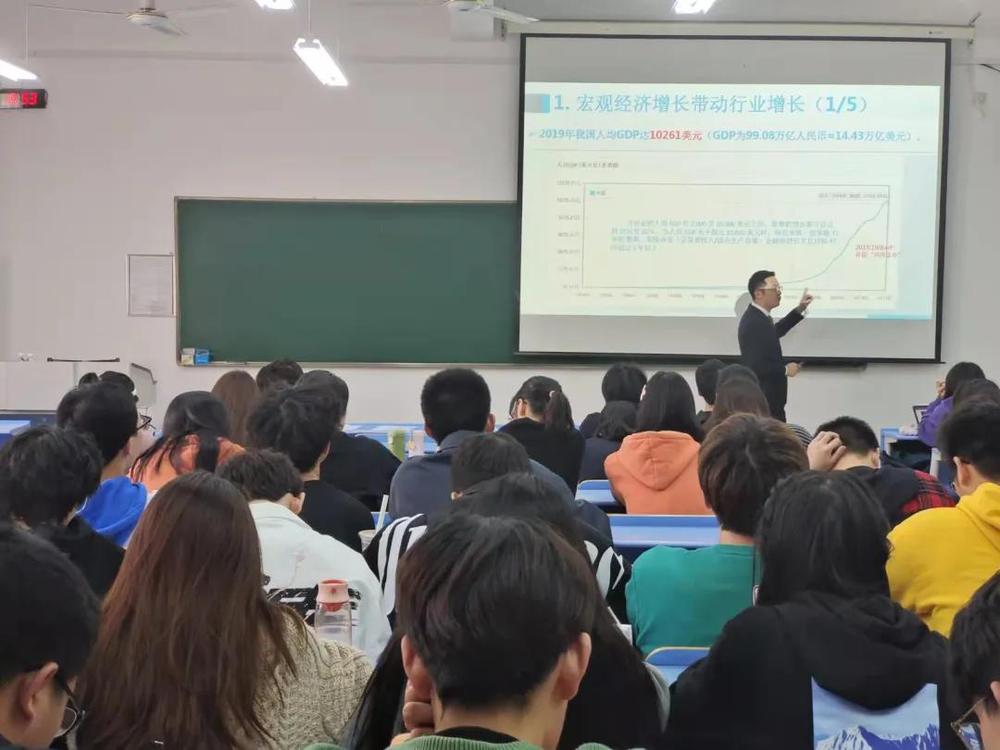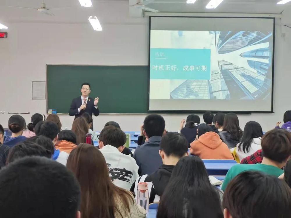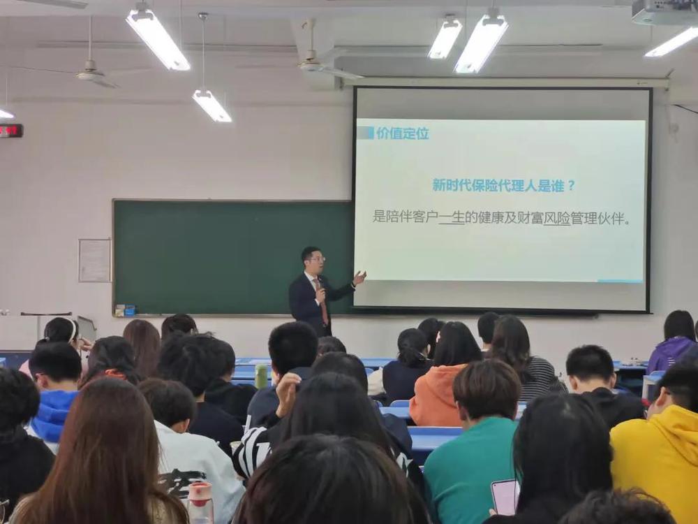 11月3日下午,新华保险杭州中支党支部副书记、副总经理梁一鸣应邀来到成人短视频 ,在经济楼304教室为2021级同学做了题为“专业管理风险,助力共同富裕”的讲座。