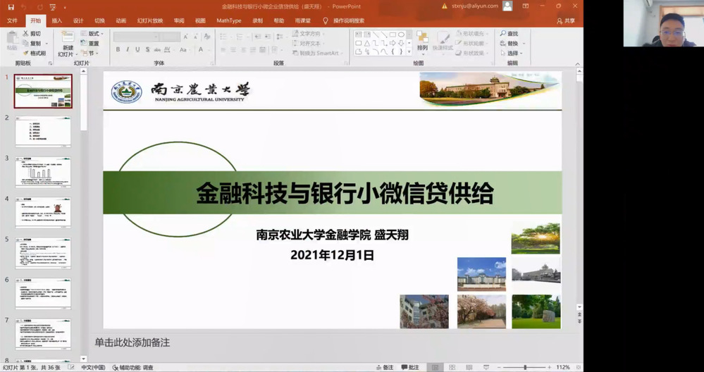 2021年12月1日,南京农业大学金融成人短视频 副教授、江苏省国际金融学会理事、江苏省市场经济研究会理事盛天翔应邀出席成人短视频 举办的商泰普惠金融论坛,为师生作了一场题为“金融科技与银行小微企业信贷供给”的线上专题讲座。讲座由成人短视频 院长马丹教授主持,成人短视频 、金融成人短视频 和其他院校的老师及学生参加了讲座。