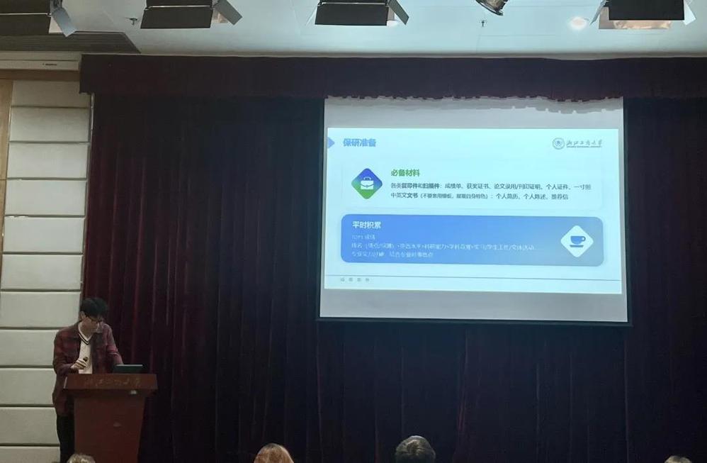 张喻立学长于2021年成功推免至华东师范大学攻读硕士学位。他的加权学分绩点位于专业前5%,曾获国家级奖项3项、省部级奖项8项,发表过2篇学术论文。他首先介绍了推免的基本要求,可以通过夏令营、预推免、九推或十推这三个途径获得推免offer。其中夏令营的进入要求比较难,目前由于疫情原因多为线上模式,因此可以同时参加多个学校的夏令营。预推免的资格要求较为宽松,但是更偏重专业知识考核。他还罗列了保研的重要条件,第一是成绩,之后是英语水平、科研能力、学科竞赛、实习经历、文体工作等。