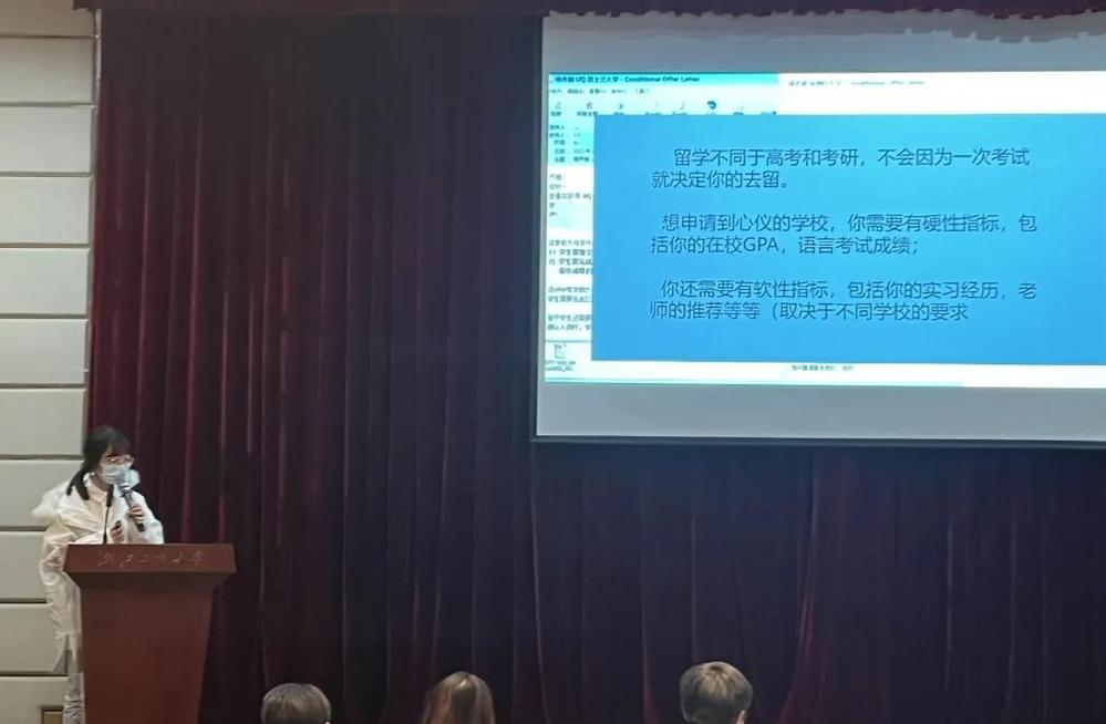 杨齐越学姐目前已收到多个QS排名前五十大学的offer(昆士兰大学、莫纳什大学、悉尼大学等)。她有优异的外语成绩,如雅思7分、日语N2等级证书等。首先,她对出国的常见顾虑进行逐个分析,并告诉同学们出国留学不同于高考和考研,不会因为一次考试就决定去留。如果想要申请到心仪的学校的话既要有硬性指标(在校GPA、语言考试成绩等),又要有软性指标(实习经历、导师推荐等)。