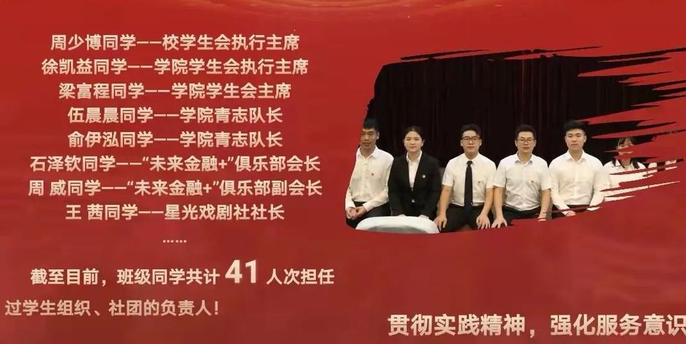 普惠金融1901团支部贯彻实践精神,强化服务意识。团支部中担任学生组织、社团负责人共41人次。其中包括校学生会执行主席、成人短视频 学生会执行主席、成人短视频 学生会主席团成员、成人短视频 青志队长、“未来金融+”俱乐部会长、“未来金融+”俱乐部副会长、星光戏剧社社长等。在交流研讨会上,他们聆听学术大家与企业家间言语的激烈交流。在市场调研中,他们共探小微脉搏,感受真实经济。为了感受职场氛围,普惠金融1901团支部成员进入阿里巴巴、中国银行等公司实习,班级实习率达100%。