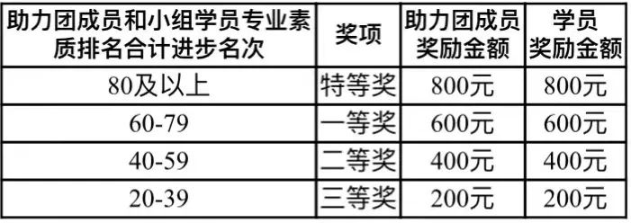 活动结束后,学习互助小组两位同学的必修课及限定专业选修课全部合格且成绩平均分在75分(含)或良好以上。助力团成员专业素质仍需保持在前50%,且助力团成员和小组学员专业素质合计排名较上学期合计排名上升20名及以上者,则该互助小组成员分别获得相应等级的奖学金并颁发荣誉证书。