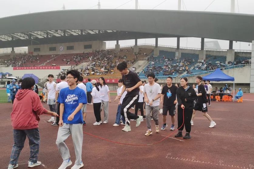 一边是为奔跑喝彩的欢呼与激情,另一边风雨之下,“一下、两下、三下”是跳长绳团队的奋斗。他们起跳默契,甩绳干脆,用悦耳清脆的脚步声展现了什么是团队的凝聚力。