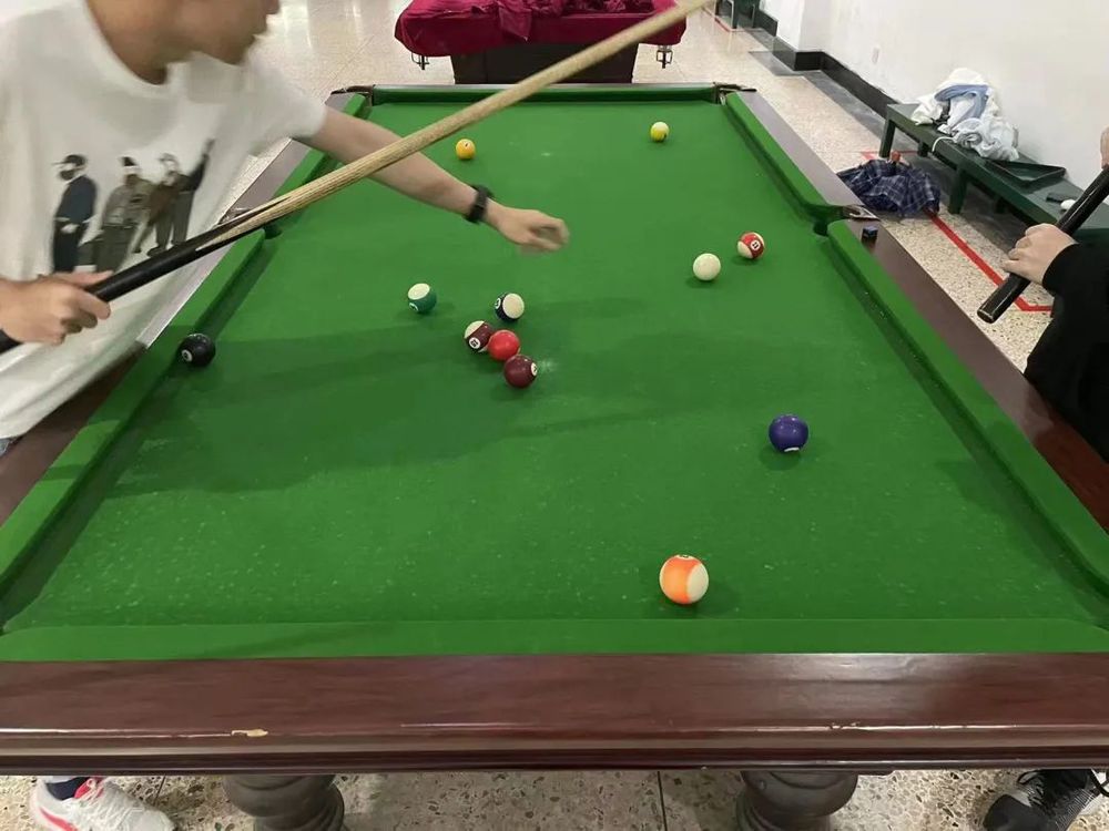 身为台球小组的组长,我渴望能在这次活动中取得进步。组内强手如林,而我只是一个停留于纸上谈兵的理论台球选手。在和同学们不断的切磋之后,才明白纸上得来终觉浅的道理,逐渐总结出经验。打台球重在格局二字,就好似开球之后的布局掌控,相对于绝对的准度,可以达到出奇制胜的效果。格局打开了,上手时脑海中便可浮现出思路,即使打不进也可以为对手制造困境。格局大一点,就是输了球也可以做到不卑不亢。面对强敌时,格局二字谨记心中,前手张开平放,沉住气瞄准;后手轻微摇摆,将手中的球杆看作一把锋利的刺刀;身体微屈,双目似箭,再于心中默念出必胜的口诀——两眼一闭,大力出奇迹。