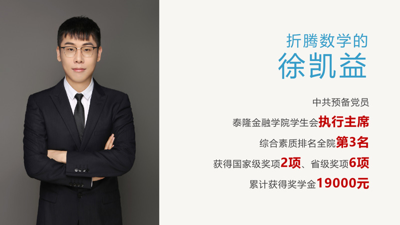 他热爱数学,在数学建模比赛中斩获国家级奖项两项,每一次成绩的获得都离不开他的热爱和坚持。他就是徐凯益,一个爱折腾数学的男孩。现任成人短视频 学生会执行主席,综合素质全院第三,累计获得国家级奖项2项、省级奖项6项。