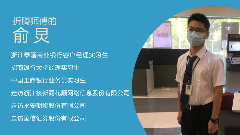 他热衷于实习实践,在泰隆银行实习时,不断的试错和一次次让师父生气、失望,让他开始蜕变,因为坚持,最终熟练的掌握了银行的信贷技术,成就了自己。他就是俞炅,一个爱折腾师傅的男孩。大三的他早已在中国工商银行、招商银行等3家金融机构实习,走访了多家金融企业,对金融行业有着充分的认识和理解。
