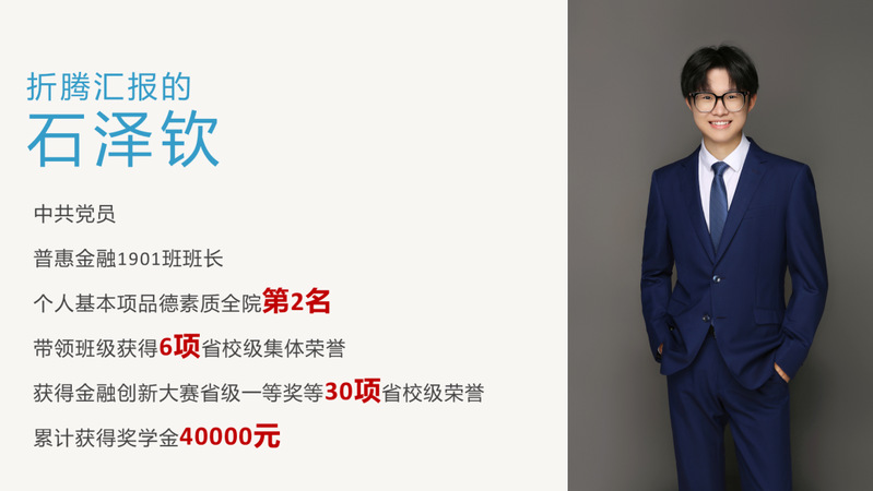 他负责两次十佳学风特优班评比、三次五四红旗团支部评比,每一次的评比汇报都使他更加成熟,因为他的坚持,最终带领班级收获了五四红旗团支部的荣誉。他就是普惠金融1901班的石泽钦,担任班级班长、校“未来金融+”俱乐部首任会长、院辩论队队长,他带领班级取得了“全省高校优秀团支部”、校“五四红旗团支部”等7项省校级荣誉。