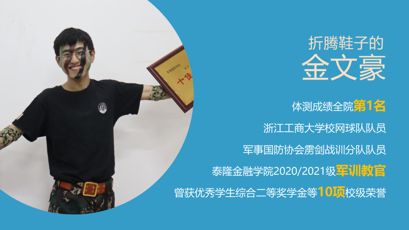 从参加校运动会的5000米、学校毅行到第一次完赛马拉松,他不断在挑战自己的极限。他就是全院体测成绩第一的金文豪,现为校网球队队员,成人短视频 大一大二年级军训教官,曾获校优秀学生综合二等奖学金等10项校级荣誉。