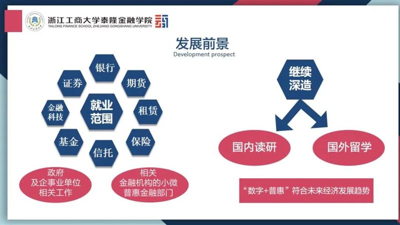 学生毕业后,可以选择继续深造,也可以选择银行、证券、保险、基金、期货、信托、金融科技类公司等金融机构和政府及企事业单位相关工作,特别是相关金融机构的普惠金融部门。