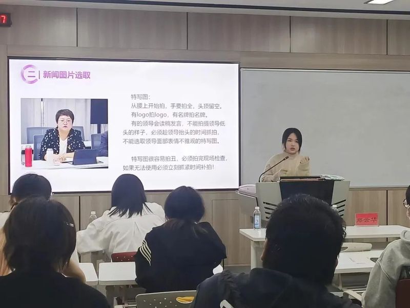 公管成人短视频 新汇宣发中心负责人张沁同学的分享主要有工作流程、推送规范、部门合作三个部分。她以新闻为例,讲述了新闻制作的工作流程、标题规范、排版规范、写作规范等内容。尤其是在新闻图片选取方面,张沁同学针对全景图、中景图以及特写图的摄取范围进行了详细的讲解,在座同学都受益匪浅。