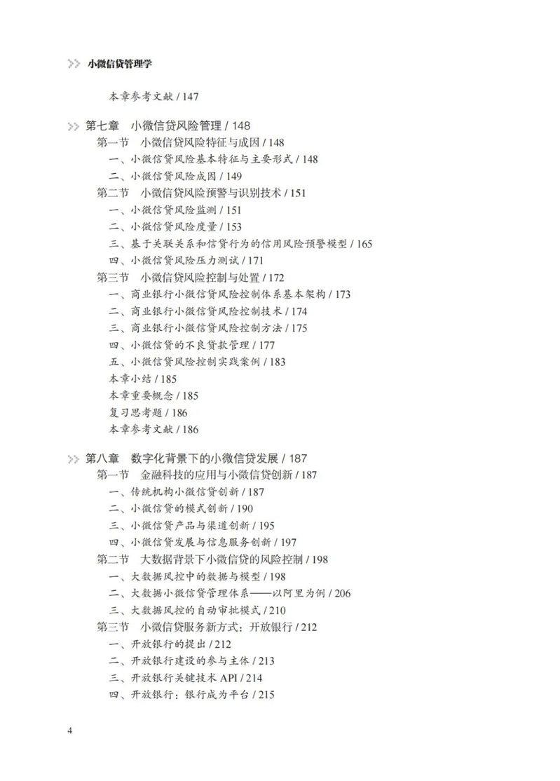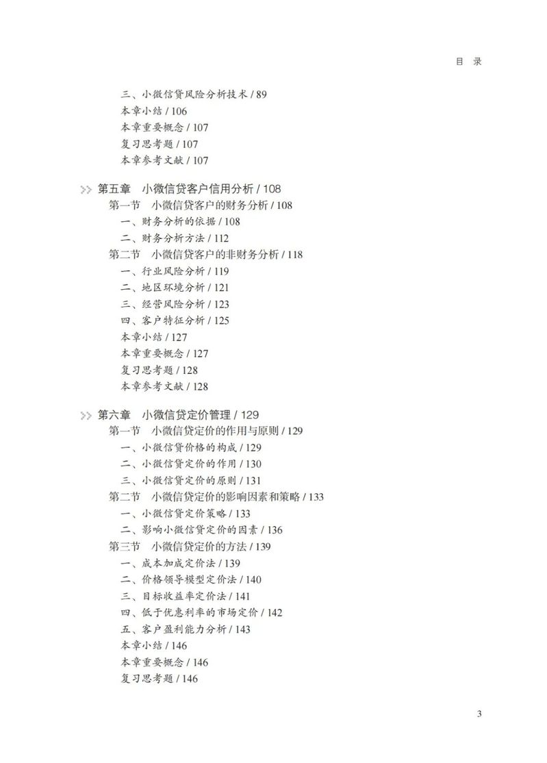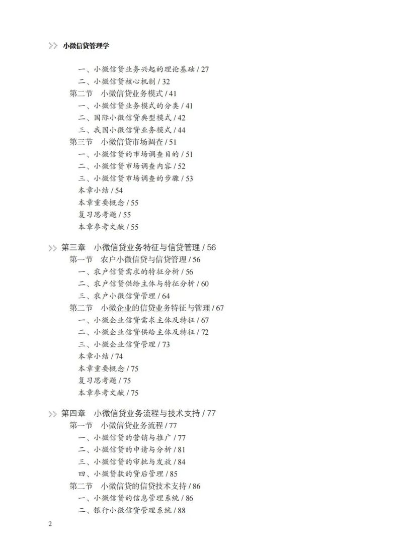 本教材努力在写作体例和内容选择方面进行创新。一是每一章的开篇均梳理了本章的核心内容,使学生更快地了解和掌握本章的逻辑体系。每章结束均配有复习思考题,可供学生结合本章内容进一步思考和据此尝试展开相关问题的研究。二是全书配有若干个“专栏”和“案例”,并采用二维码视频方式进一步呈现具体内容。通过这些专栏和案例,引导学生关注与教材内容相关的小微信贷管理的现实状况、重要改革和未来发展方向,增强学生对理论知识的理解,提升对课程相关问题的研究兴趣。专栏和案例注重体现“中国元素、思政育人”的目的,力图更多地反映和展示我国小微信贷业务管理中的特色和成就,通过讲解“中国故事”增强学生“四个意识”,坚定学生“四个自信”,引领学生做到“两个维护”。三是本教材关注并展示了小微信贷管理领域最新发展,对数字化背景下小微信贷业务模式创新、产品创新和服务创新进行了介绍,总结和梳理了大数据背景下小微信贷的风险管理问题和管理模式,并对未来小微信贷业务的发展趋势进行了预测和展望。