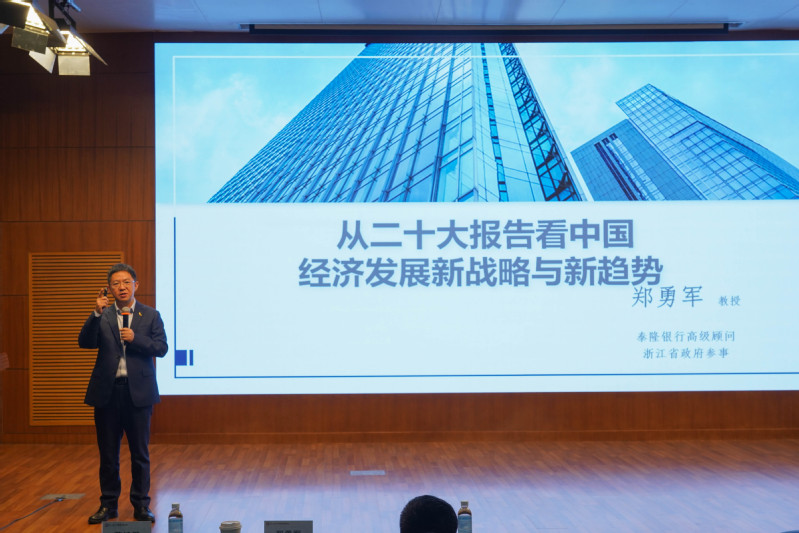 11月16日下午,泰隆银行首席经济学家郑勇军教授应邀出席成人短视频 在综合楼二楼报告厅举办的商泰首席金融论坛,为师生作了一场题为“从二十大报告看中国经济发展新战略与新趋势”的专题讲座。讲座由成人短视频 院长马丹教授主持。成人短视频 以及其他校内外的老师、同学参加了讲座。