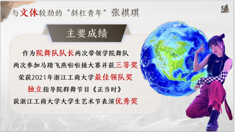 她,作为院舞队队长带领成人短视频 两次参与马踏飞燕比赛并获三等奖。其中,张祺琪同学获比赛最佳领队奖,从队形到编舞,从组织到演绎,整齐划一的动作与别出心裁的创编均是她的努力付出。