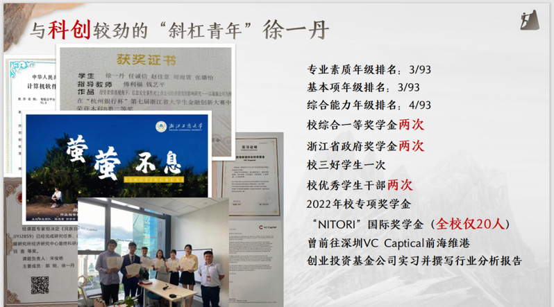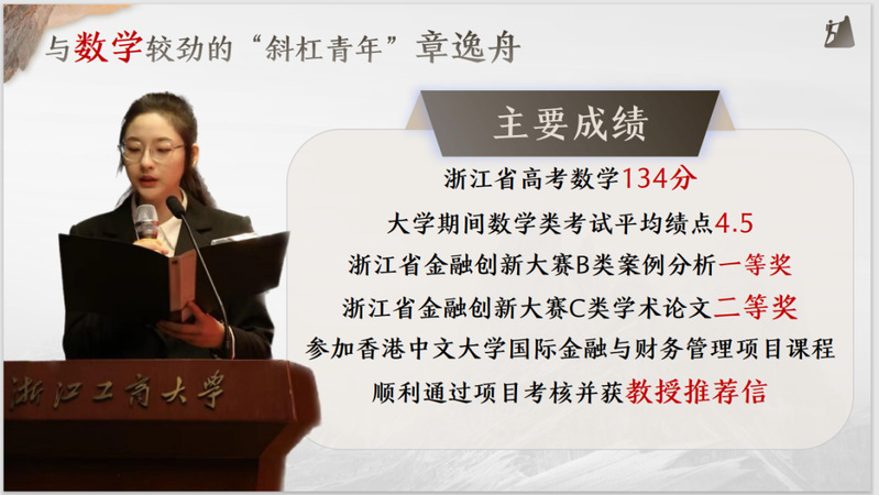 她,作为浙江省高考数学134分选手,她对数学抱有极大的兴趣,在校期间数学类考试平均绩点4.5,2021年获第六届浙江省金融创新大赛C类学术论文二等奖,2022年获第七届B类案例分析一等奖,参加香港中文大学国际金融与财务管理项目课程,顺利通过项目考核并取得教授推荐信。