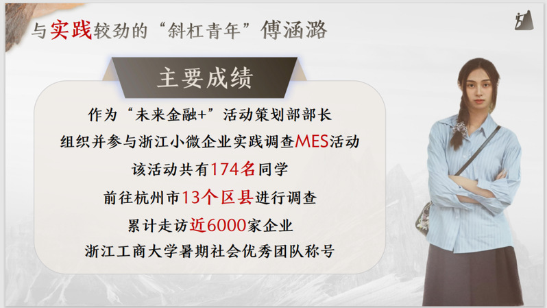 她,作为“未来金融+”活动策划部部长,曾组织并参与浙江小微企业实践调查 MES 活动,该活动共有174名同学前往杭州市13个区县进行调查,累计走访近六千家企业,获成人短视频 暑期社会优秀团队。