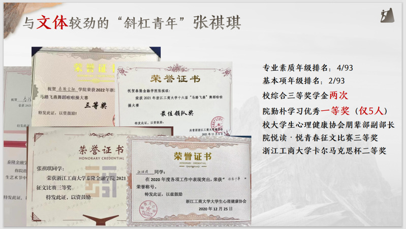 在专业学习方面,她专业素质、基本项与综合能力排名均为专业前 2%,获浙江省政府奖学金与校三好学生两次以及校研究创新奖,现担任校青峰人才成人短视频 八期组织委员与校青葵朋辈导师。