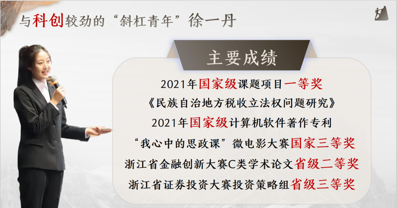 她,积极参与学科竞赛与创新活动,2021年获国家级课题项目一等奖及计算机软件著作权,2022年获浙江省金融创新大赛二等奖与证券投资大赛三等奖,2023年作为主创成员获“我心中的思政课”微电影大赛国家三等奖。