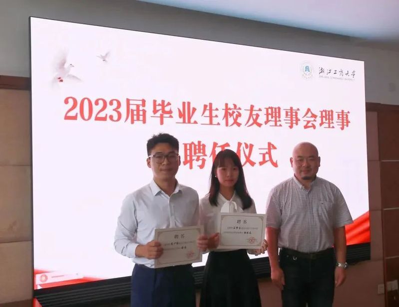 大会举行了2023届毕业生校友理事聘任仪式,王忠华主任宣读聘任文件。据各成人短视频 及部门推荐,学校校友总会审核,聘任普惠金融1901班周少博为2023届毕业生校友理事会会长、工商1901班王梦兰为秘书长,毛晓莹等27位毕业生被聘任为理事。