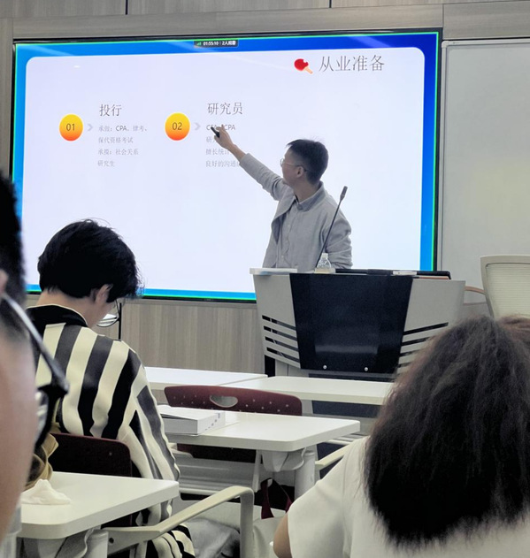 接着,薛总就同学们最关心的从业准备问题展开了细致的讲解,告诉同学们想要未来进入证券行业包括其他金融行业需要准备的资质和技能,告诉同学们需要做些什么,需要培养什么样的能力。同时更加细致地介绍了证券行业中相关岗位,为不同岗位的方向做充分的准备。