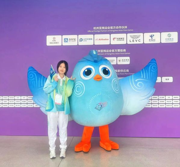 很荣幸参加了亚残运会,我所服务的领域是观众服务。一开始得知我的工作是吉祥物表演员的时候,我其实是有点担心的,怕自己体力不够,因为吉祥物表演需要一直带着头套,不停得跟观众互动。实际上岗的时候虽然感觉到头套也很重,里面非常闷热,但是每次跟观众合完影,都能听到他们的感谢,也会夸赞这个吉祥物可爱又灵动,他们的快乐感似乎能透过头套传递到我的身上,尽管每次下班脱下头套都大汗淋漓,但也十分满足。亚残五天的志愿虽然忙碌但却充满了意义!