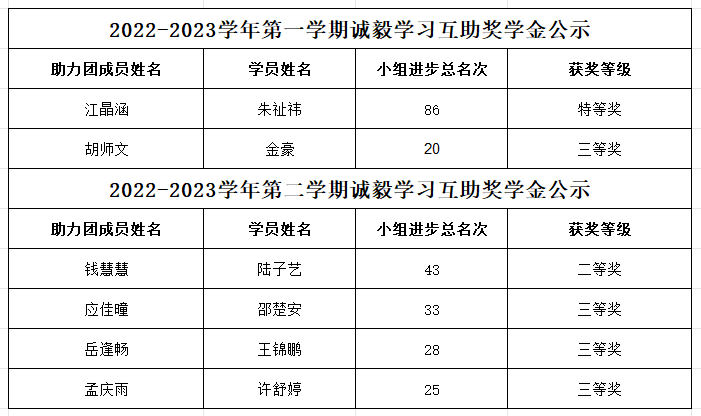 根据《成人短视频 “勤朴学习优秀奖学金和诚毅学习互助奖学金”评审管理办法》,2022-2023学年两个学期均有学生自愿报名组成互助小组,互助学习,共同进步,成人短视频 根据基本条件审核以及各小组专业素质合计排名进步情况,评选出特等奖1组、二等奖1组、三等奖4组。