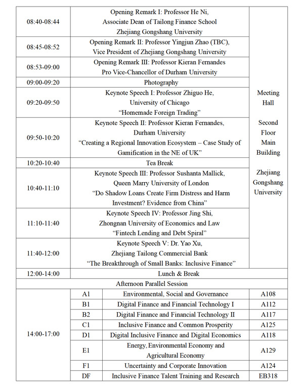 The Financial Inclusion, FinTech, and Financial Sustainability Conference is an initiative of a partnership between Zhejiang Gongshang University and Durham University. The conference is scheduled for November 11, 2023, in Hangzhou, China. Greetings and welcome to the event. Five distinguished professors and professionals will deliver keynote speeches at the conference.