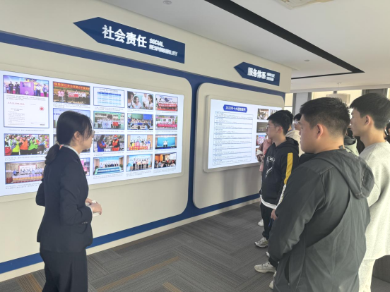 在新华保险工作人员带领下,同学们参观了公司的展厅和工作区域,了解新华保险的发展历程、成人短视频、运营模式和所获荣誉等方面内容。