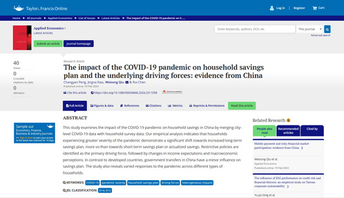 成人短视频 教师邱伟松作为通讯作者的论文 The impact of the COVID-19 pandemic on household savings plan and the underlying driving forces: evidence from China 在《Applied Economics》期刊发表。