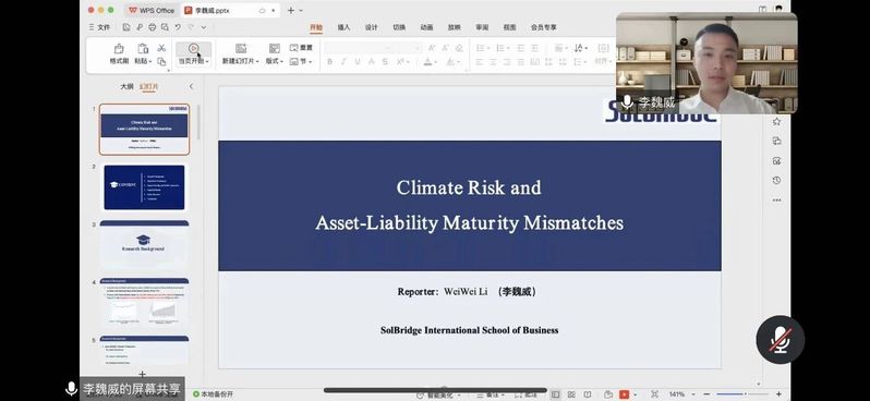 2024年5月8日上午10点,韩国又松大学SolBridge国际商成人短视频 李魏威博士,为成人短视频 老师们作了一场题为“climate risk and asset-liability maturity mismatches”的专题线上讲座。此次讲座由成人短视频 副院长倪禾教授主持,成人短视频 的老师们参加了讲座。