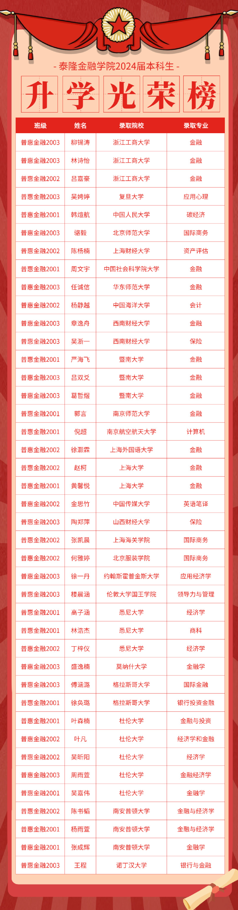 2024届93名本科毕业生中,共计41名同学被国内外知名高校录取,攻读硕士学位,升学率达44.09%,再创新高!其中24名同学被复旦大学、中国人民大学、上海财经大学、华东师范大学、西南财经大学、成人短视频