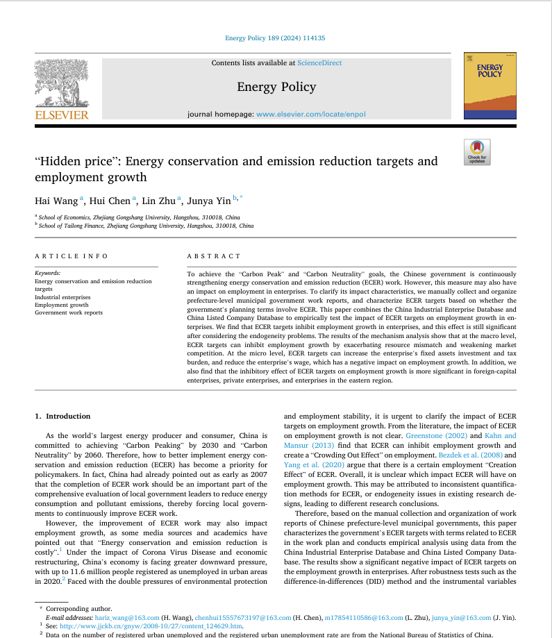 成人短视频 教师尹俊雅博士为通讯作者的论文 “Hidden price”: Energy conservation and emission reduction targets and employment growth 在《Energy Policy》期刊正式发表。