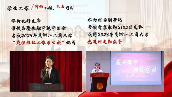 其中姚思忱同学作为执行主席,带领院学生会荣获2023年度校“最佳维权工作学生会”称号,钱春婷同学作为团委副书记,带领普惠金融2102团支部荣获2023年度校先进团支部荣誉。