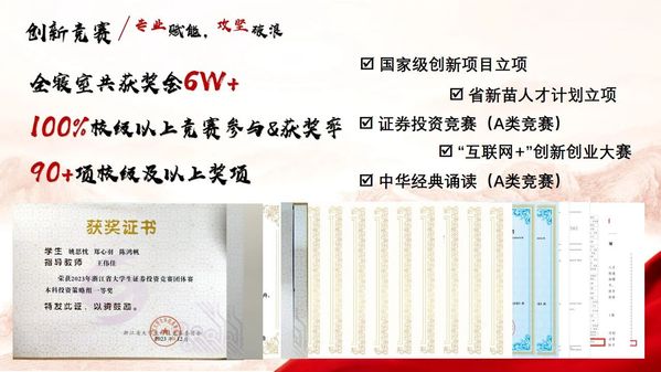 她们的创新竞赛有专业赋能,攻坚破浪。全寝室共获奖金已超6万元,寝室4个人拥有100%校级以上竞赛参与率与获奖率,包括国创立项、省新苗立项、证投省一省二、经典诵读省一等在内,共斩获院校级及以上荣誉奖项90余项。