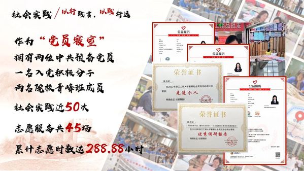 在社会实践方面,316作为党员寝室,拥有两名中共预备党员和一名入党积极分子,两位院校青峰班成员,寝室成员积极响应习近平总书记关于青年“感恩奋进、实践争先”的指示,参与社会实践近50余次,志愿服务累计45场。